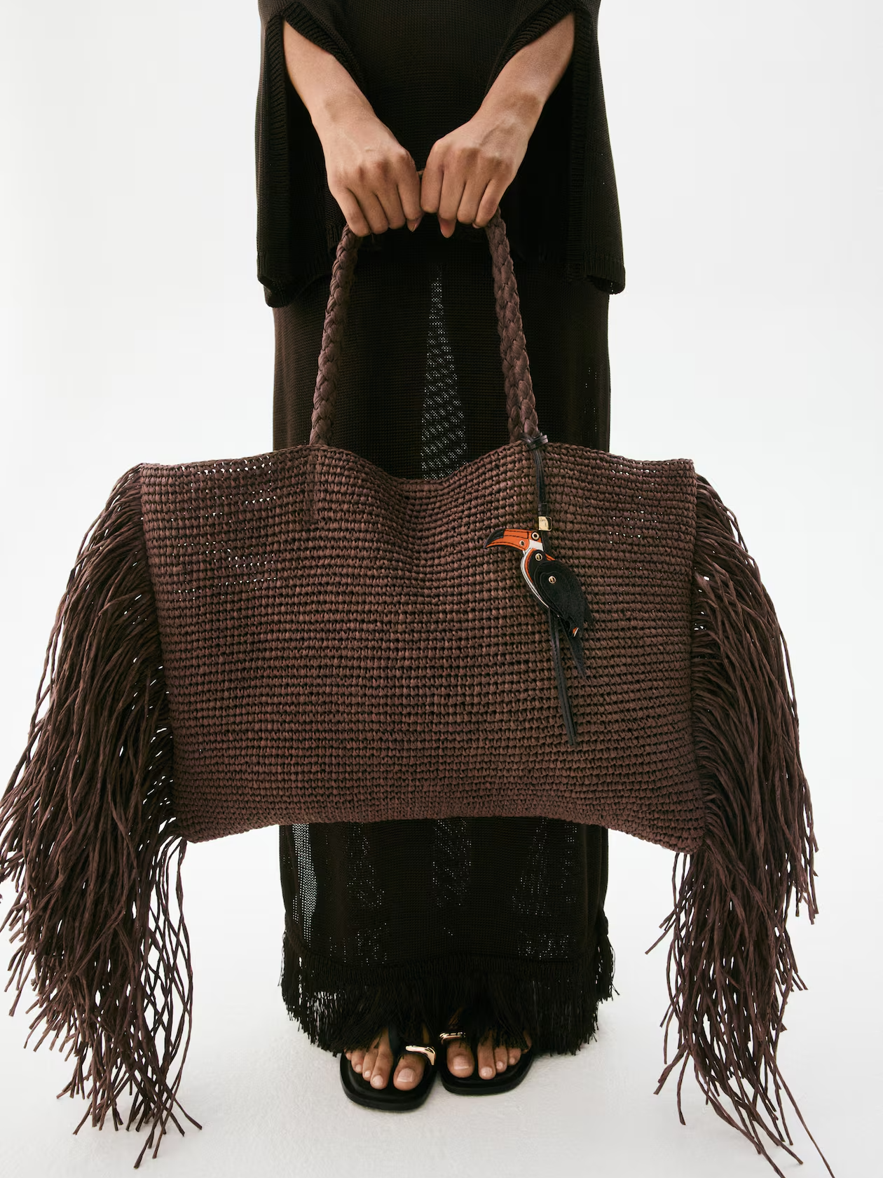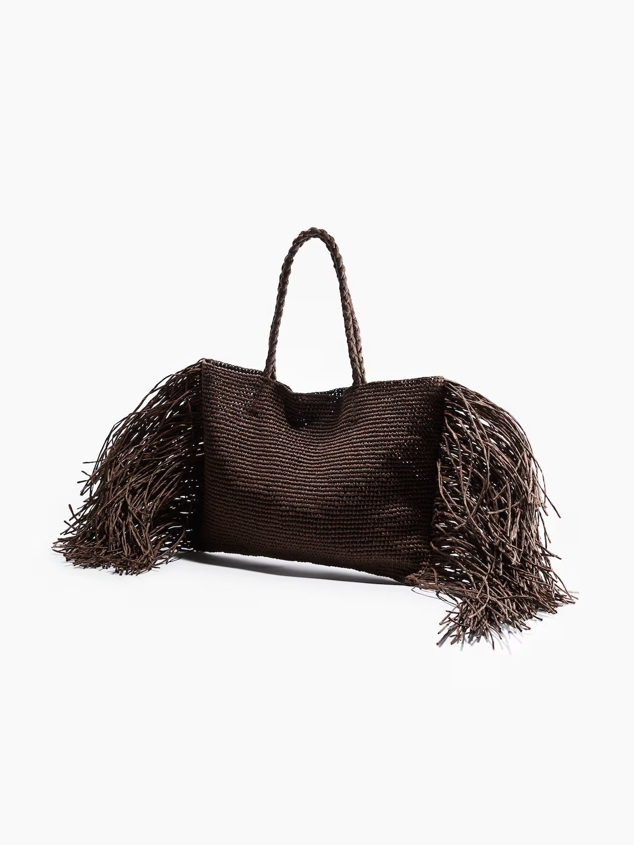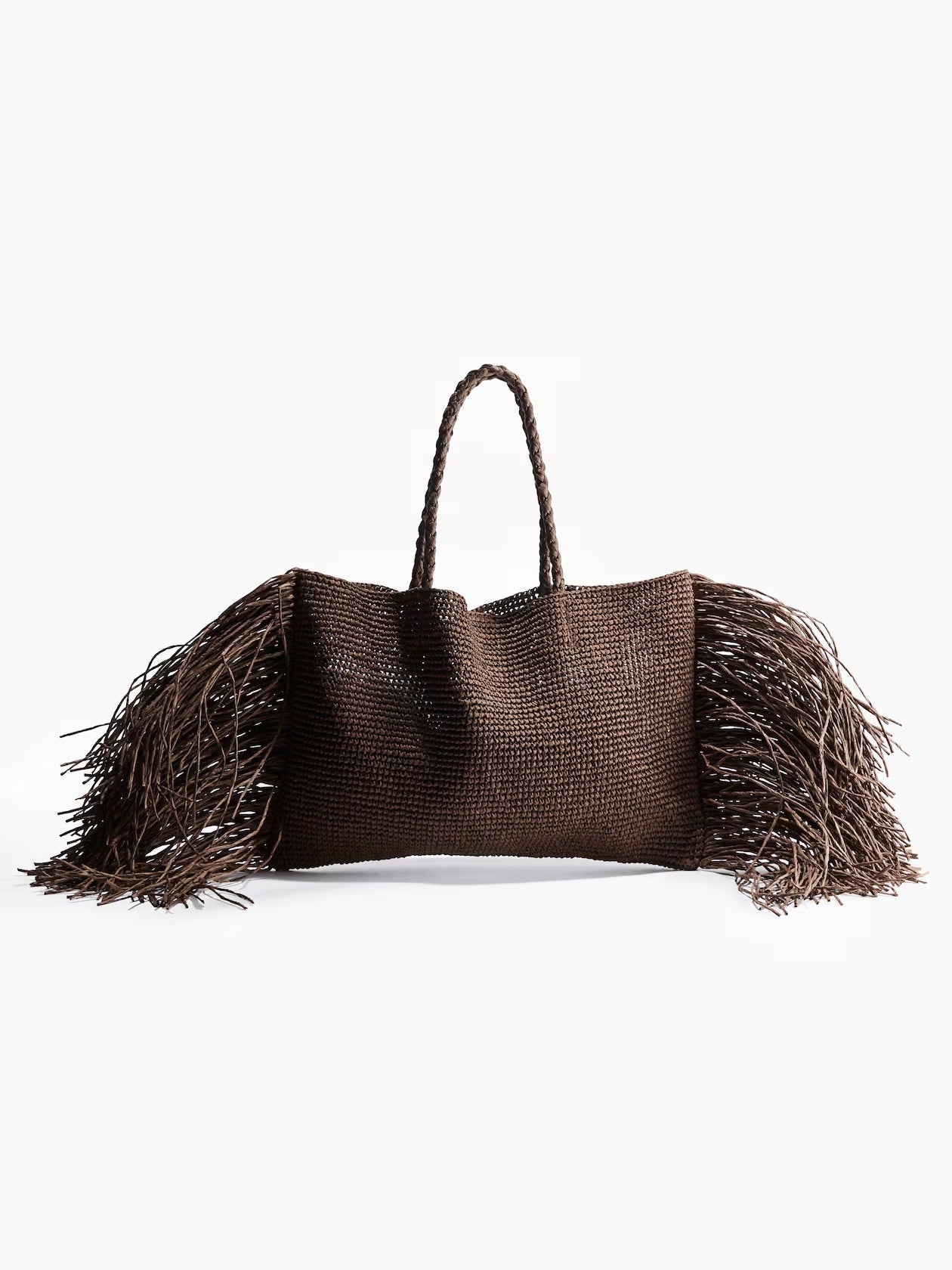 Oversized bag in braided paper straw with long fringe at short sides for an eclectic touch. Long, braided handles for carrying bag on your shoulder or in your hand. Concealed magnetic fastener at top. Unlined.