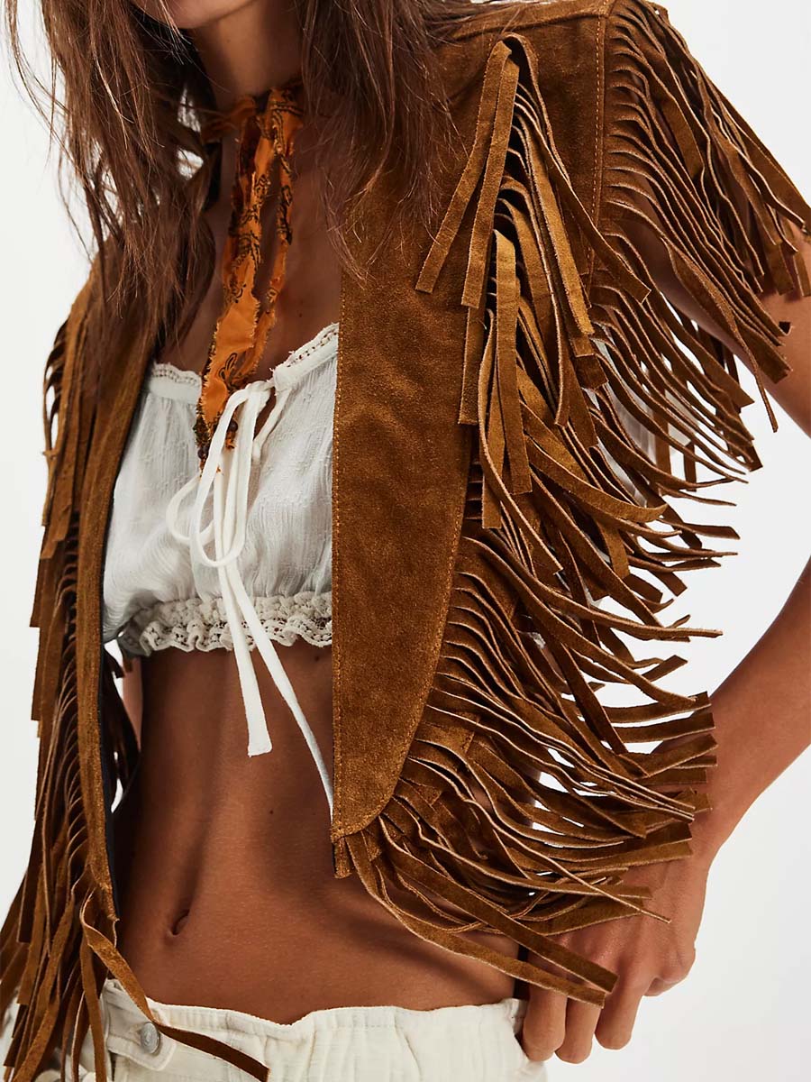 - Features: Drapey at front, suede fabrication, defined fringe throughout slightly defined shoulders