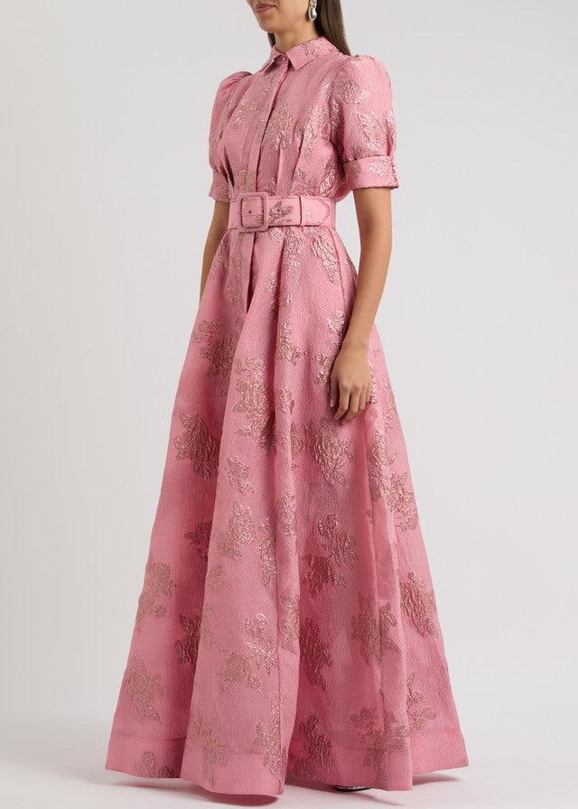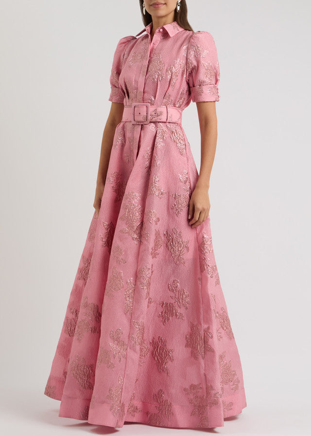 Waist-Cinching Button-Down Jacquard Maxi Dress is balanced with a darted waist and a belt. Playful and classic, this textured cloqué style is woven all-over with a metallic floral jacquard and is tailored with elegant puff sleeves and a collared neckline.