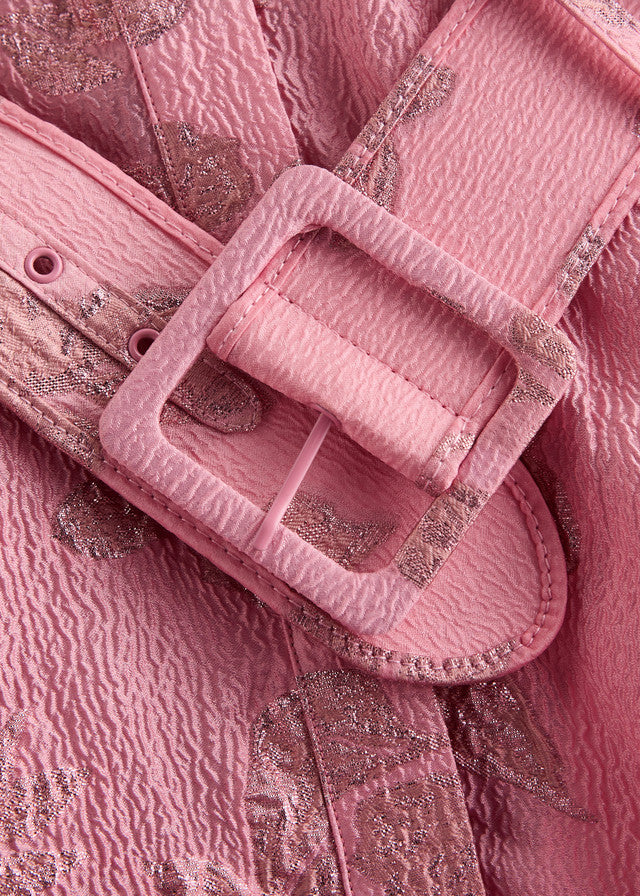 Metallic floral jacquard, slightly padded shoulders, puff sleeves, turn-up button-fastening cuffs, pleated details at waist, buckle-fastening belt, side slip pockets, detachable slip dress lining