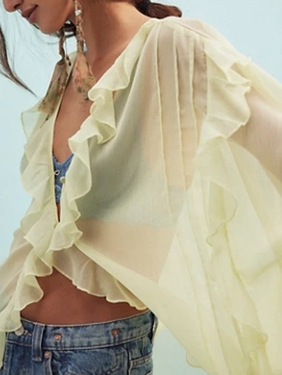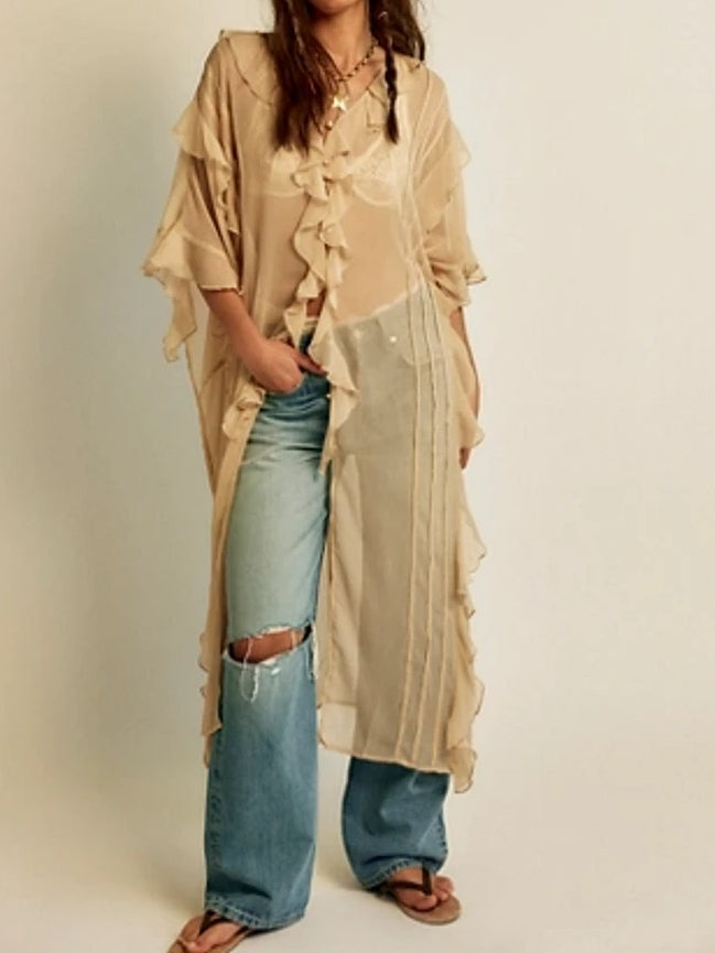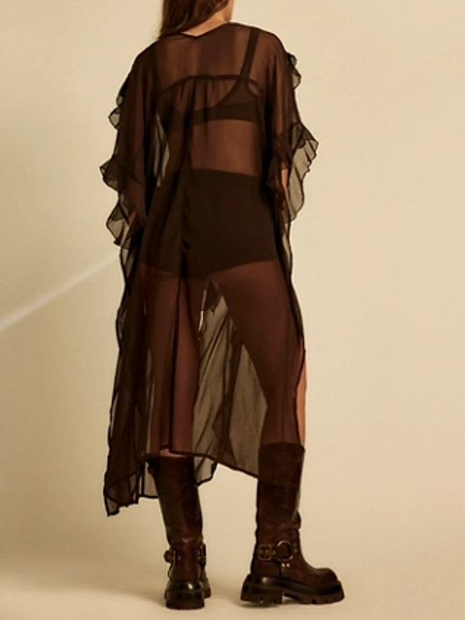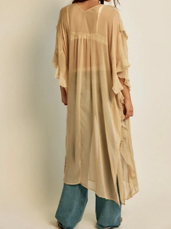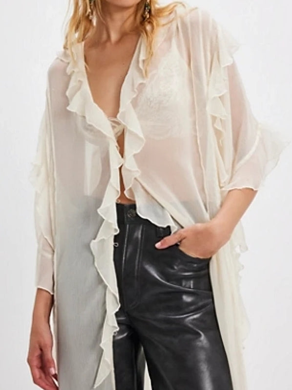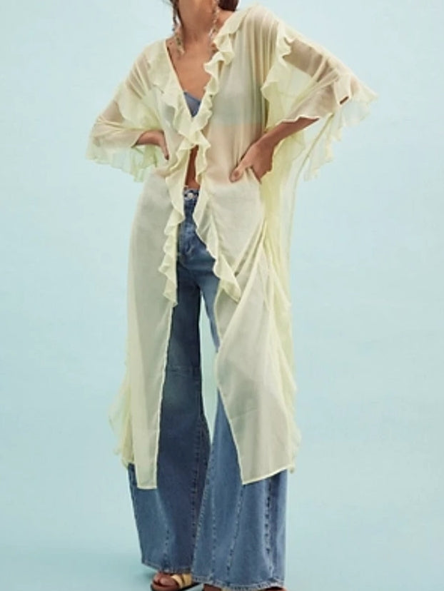 Effortlessly femme and ethereal, this beautiful kimono features a sheer fabrication and longline silhouette with ruffled trim and button closures. Hand Wash Cold Import.