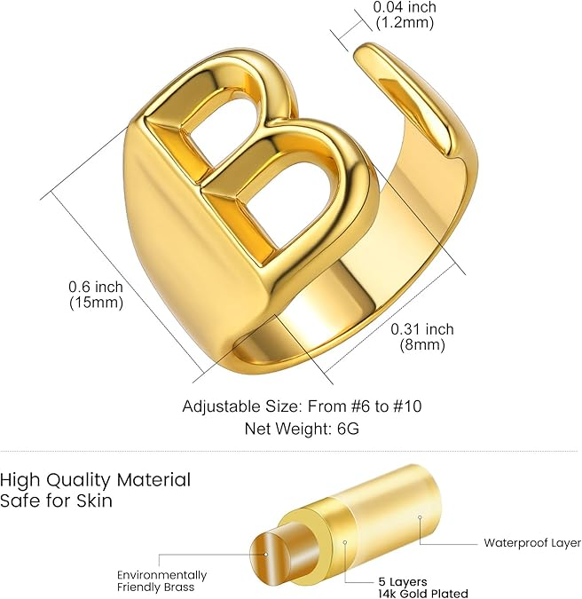 RINGS FEATURES: Featuring a bold, uppercase alphabet letter, it allows you to showcase your initial. The non-tarnish finish ensures lasting shine, and stacking options offer a unique, personalized look